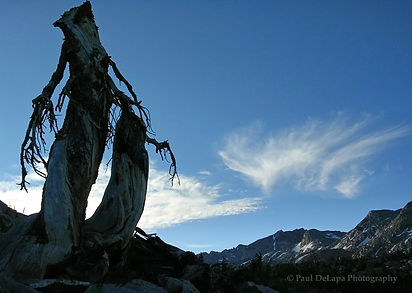 The White Mountains on the east side of Owens Valley are home to the extraordinary and bizarre Bristlecone Pine trees. These ancients, the eldest over five-thousand years old, stand bare and exposed having survived centuries of harsh sun, wind, altitude, and soil erosion; even the deceased among them still beaming with gnarled elegance and grace. The Sierra Nevada to the west provides a magnificent backdrop as these sentinels posture and pose and peak east toward Death Valley. I love to spend time with the elders when travelling on the southeast side of the Sierra, their ten thousand foot altitude providing a perfect place for acclimating before hiking into the high Sierra.